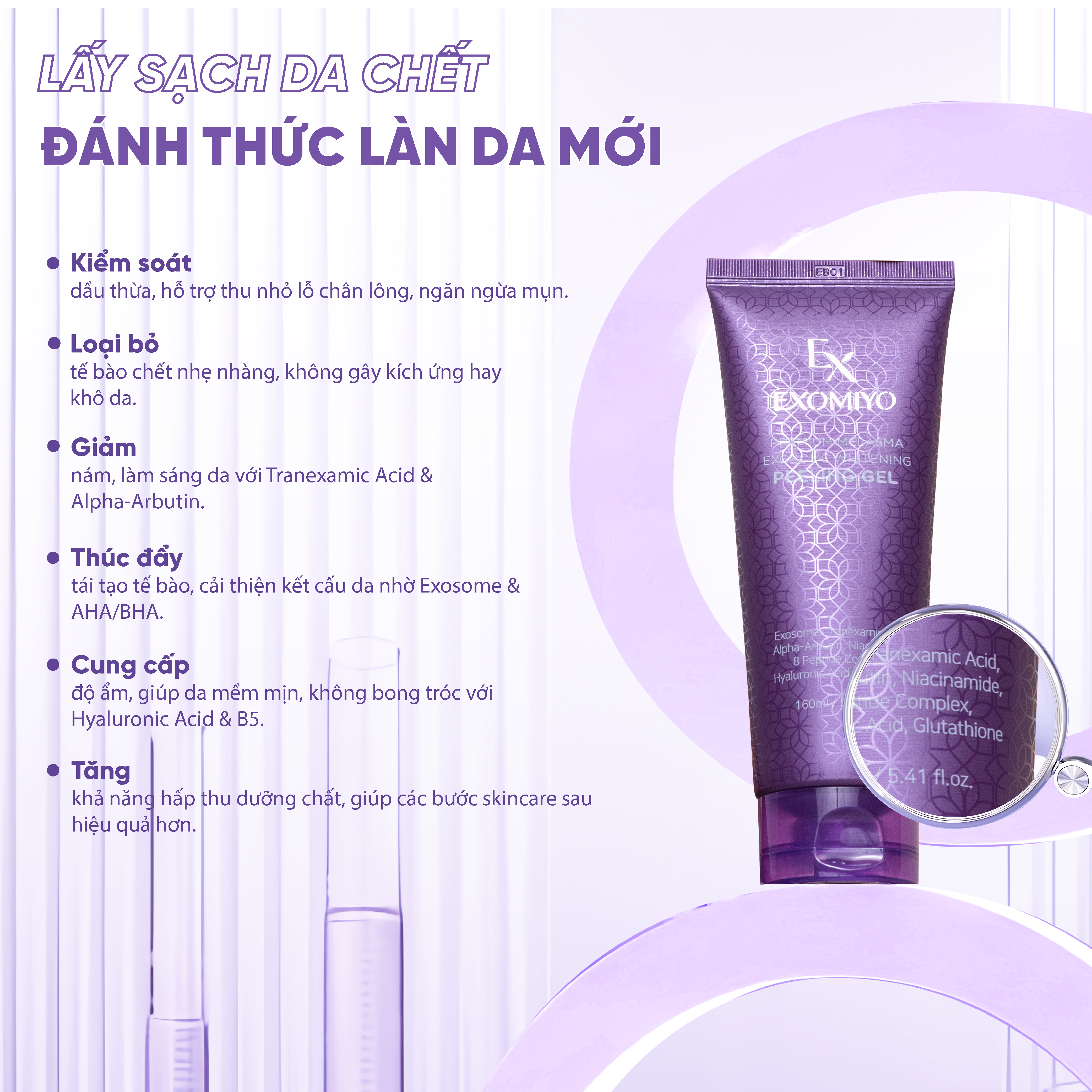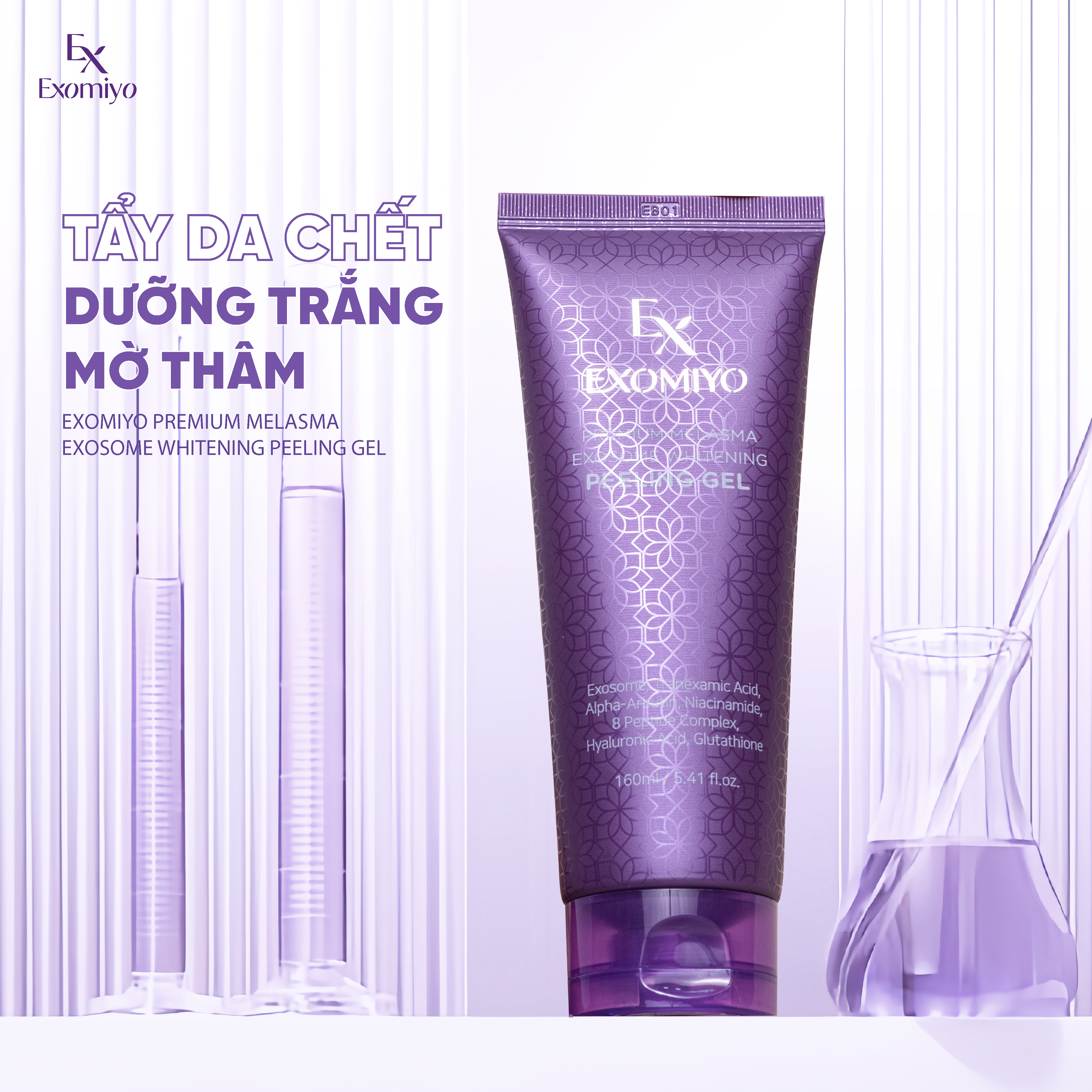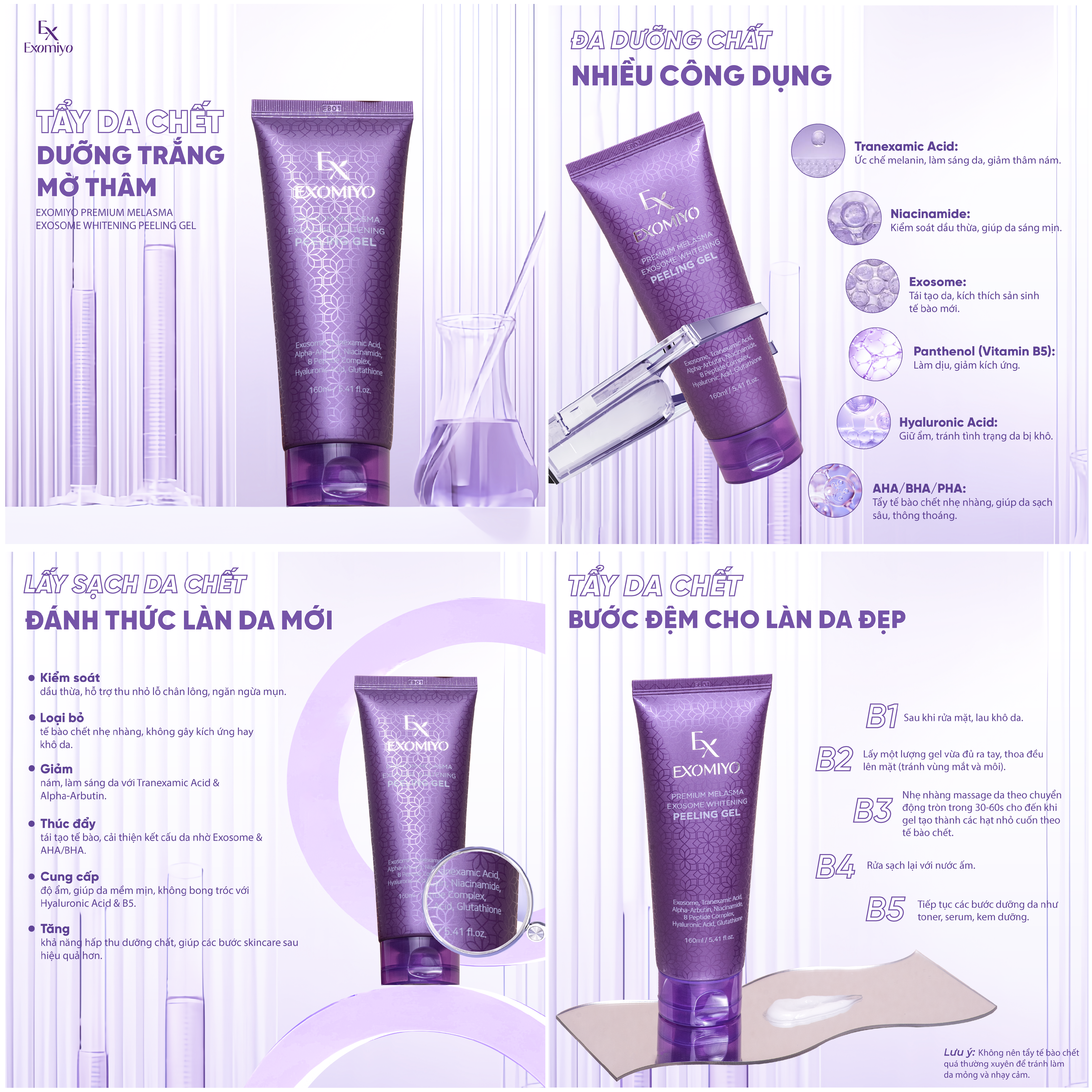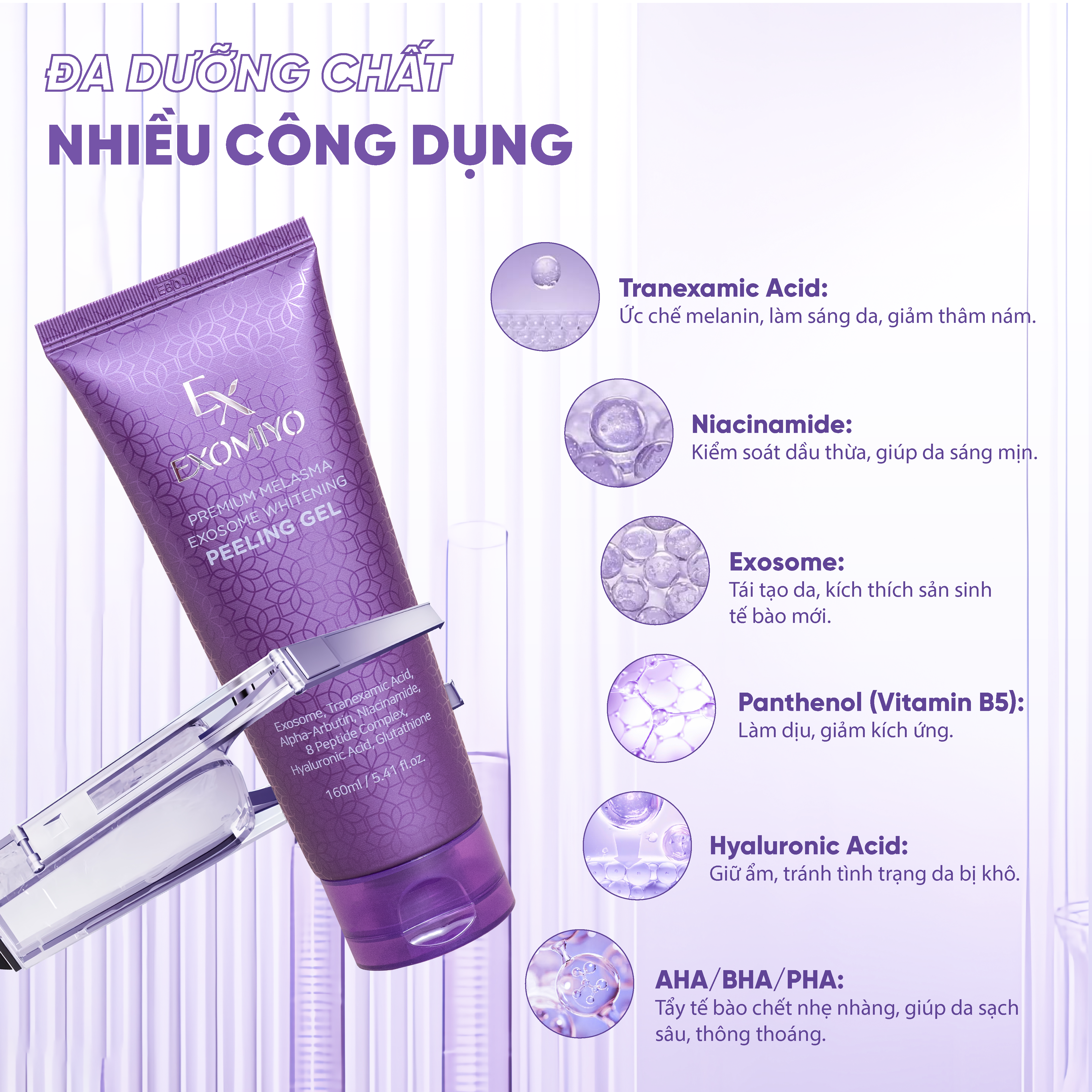 Thành phần nổi bật: Exosome, Tranexamic Acid, AHA/BHA/PHA, Niacinamide, Panthenol (Vitamin B5), Hyaluronic Acid