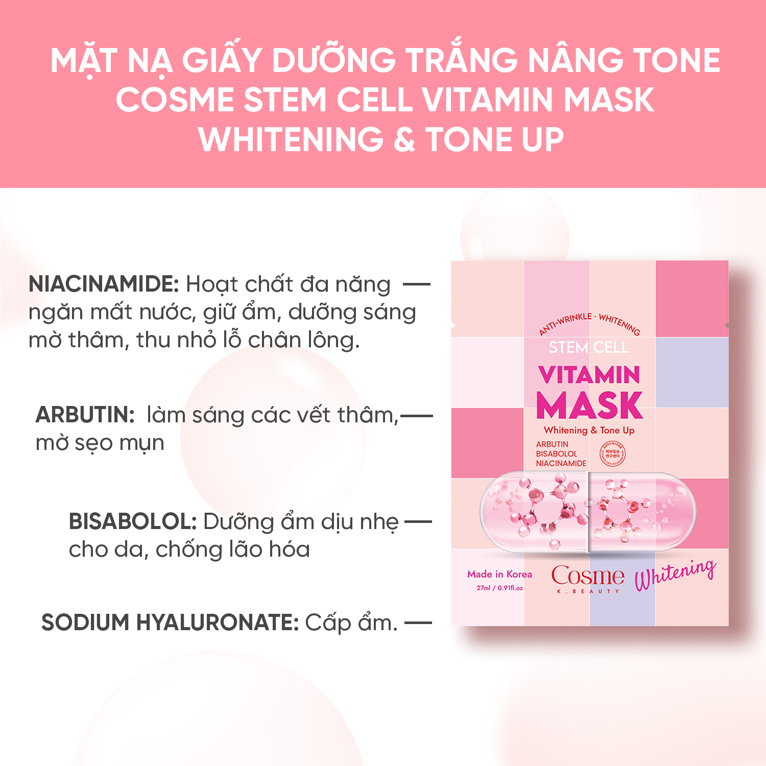 – Niacinamide: Hoạt chất đa năng: ngăn mất nước, giữ ẩm, dưỡng sáng, mờ thâm, thu nhỏ lỗ chân lông.
