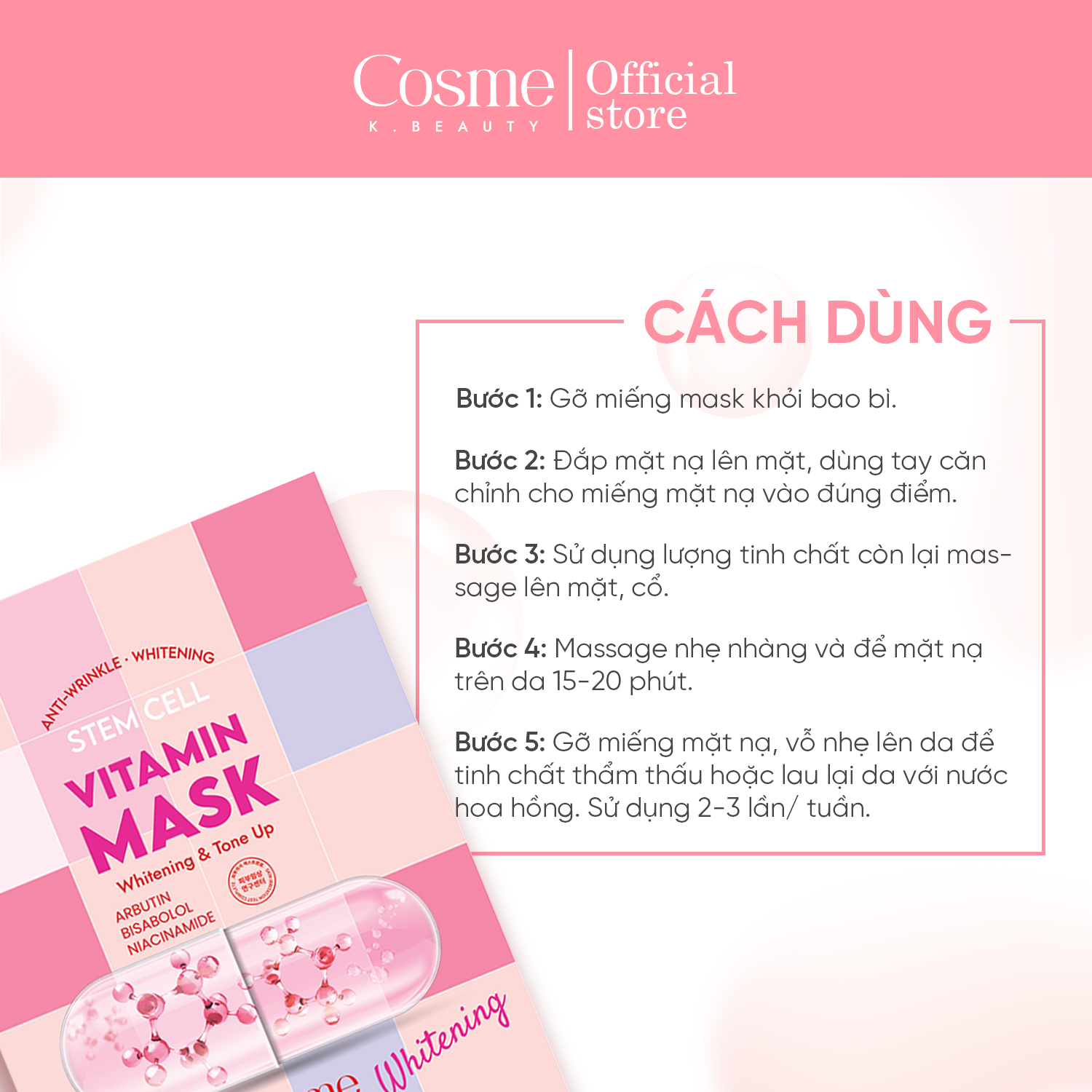 (6) Gỡ miếng mặt nạ, vỗ nhẹ lên da để tinh chất thẩm thấu hoặc lau lại da với nước hoa hồng.