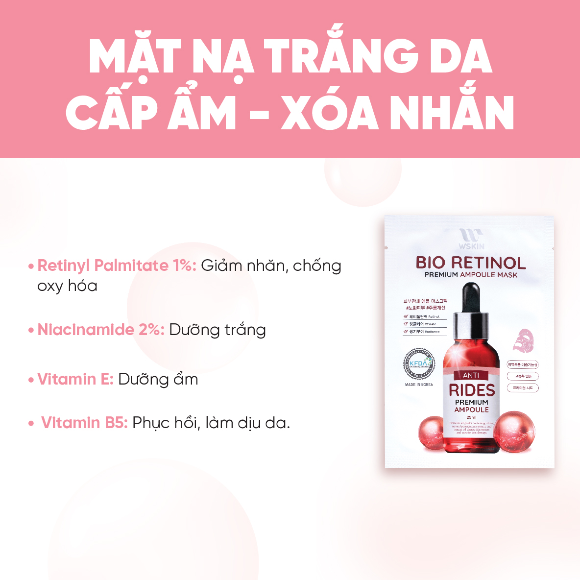 Thành phần chính: Retinyl Palmitate 1% (giảm nhăn, chống oxy hóa), Niacinamide 2% (dưỡng trắng), Vitamin E (dưỡng ẩm), Vitamin B5… (Chi tiết các thành phần xem trên bao bì sản phẩm).