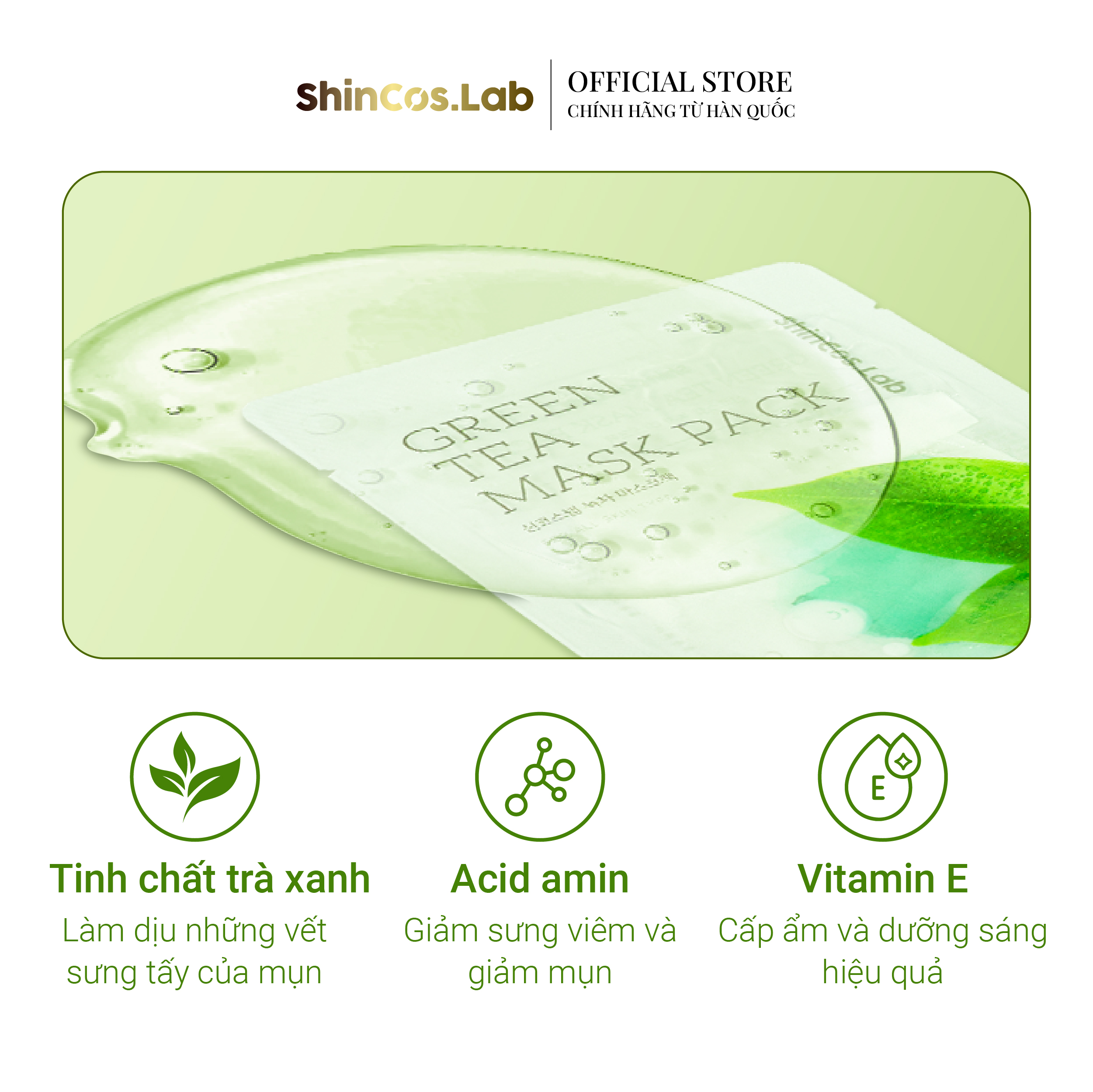 Mặt nạ Shincos.Lab tinh chất trà xanh có chứa nhiều loại vitamin và acid amin có lợi cho làn da. Trong trà xanh có nhiều thành phần hỗ trợ làm dịu những nốt sưng tấy của mụn, lành tính với làn da