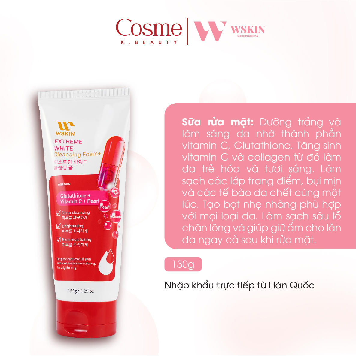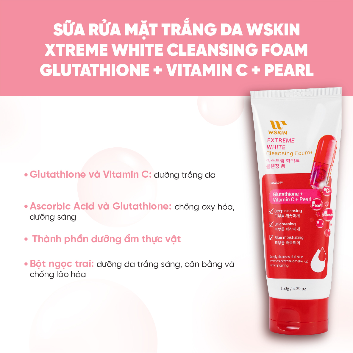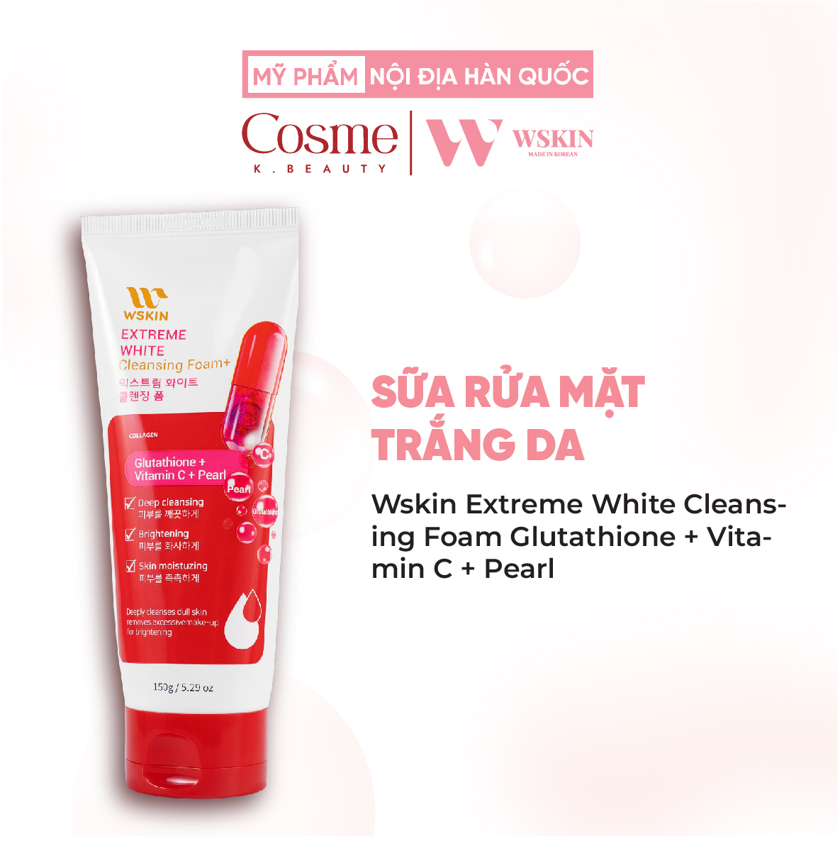 Sữa Rửa Mặt Trắng Da Wskin Extreme White Glutathione Pearl Vitamin C