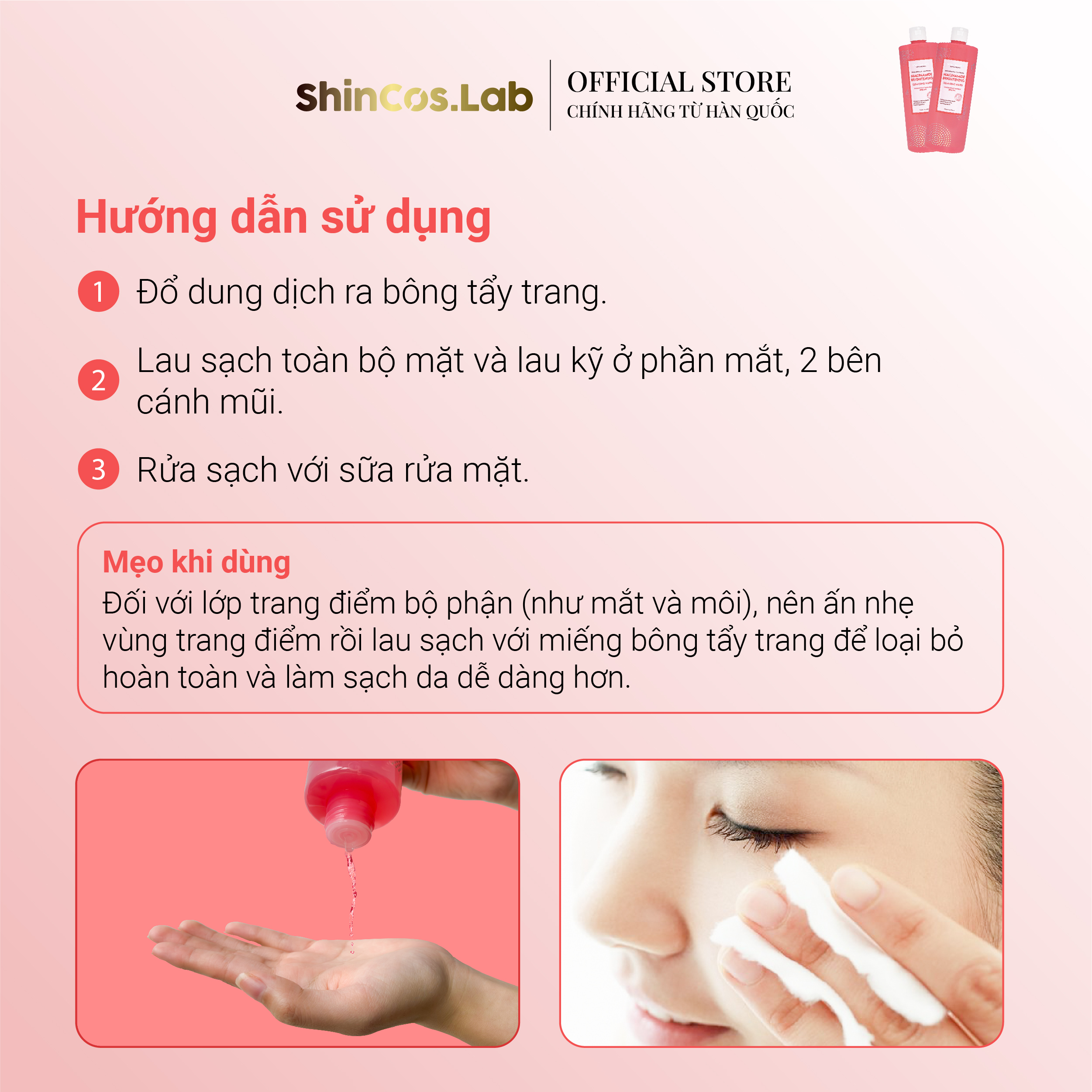 Hướng dẫn sử dụng:(1) Đổ dung dịch ra bông tẩy trang. (2) Lau sạch toàn bộ mặt và lau kỹ ở phần mắt, 2 bên cánh mũi. (3) Rửa sạch với sữa rửa mặt.