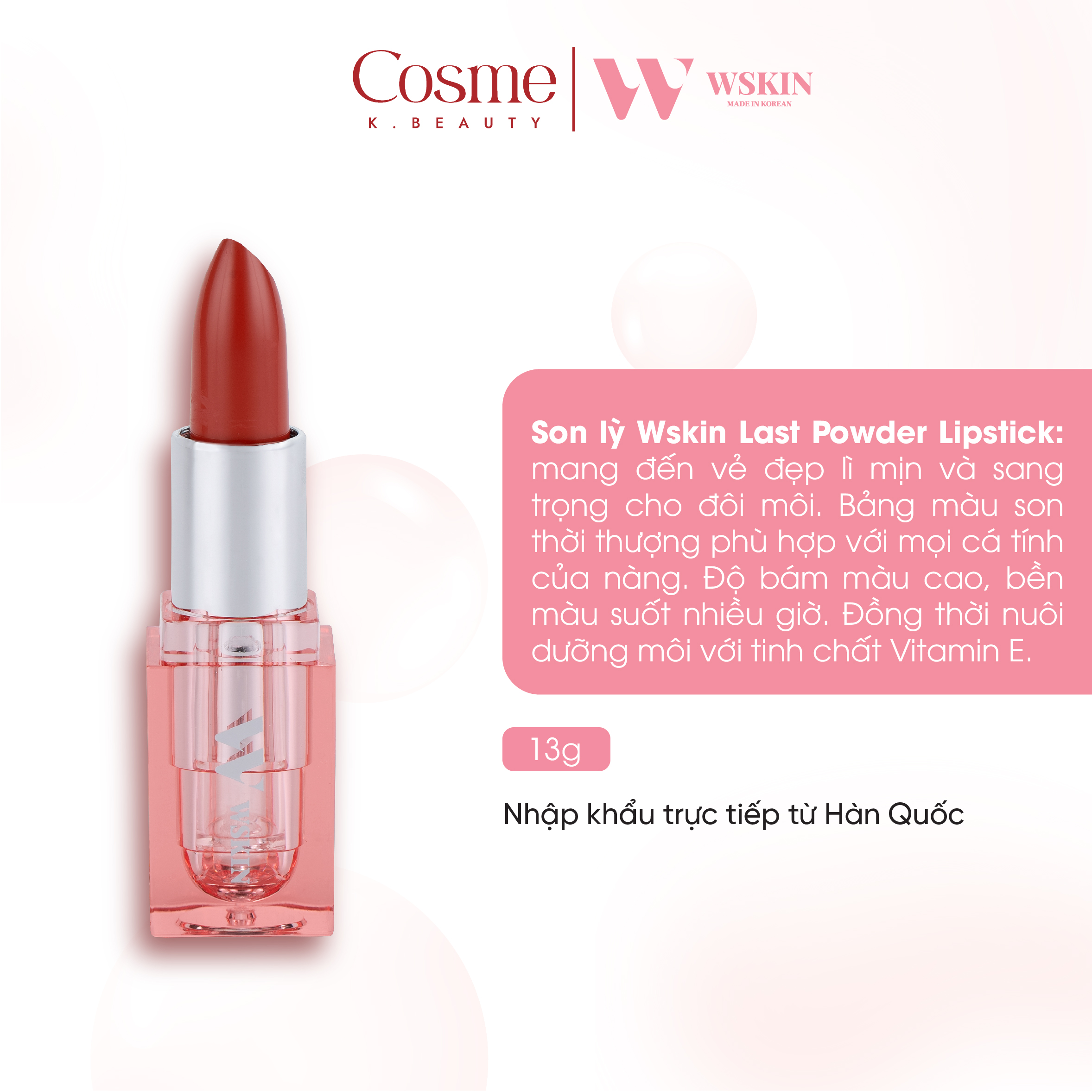 Son lỳ Wskin Last Powder Lipstick mang đến vẻ đẹp lì mịn và sang trọng cho đôi môi. Bảng màu son thời thượng phù hợp với mọi cá tính của nàng. Độ bám màu cao, bền màu suốt nhiều giờ. Đồng thời nuôi dưỡng môi với tinh chất Vitamin E.