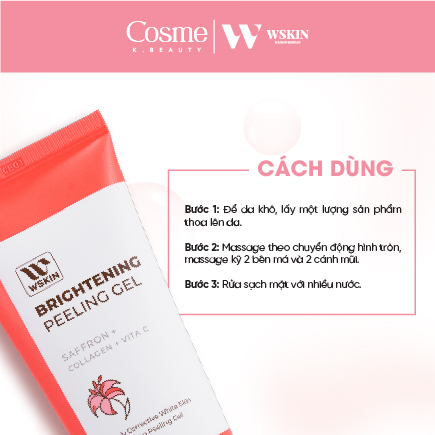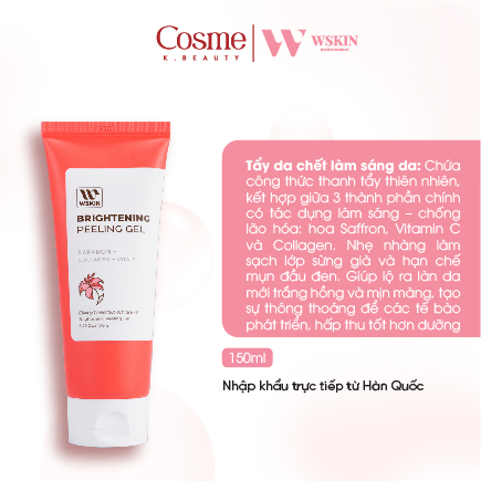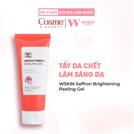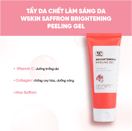 Tẩy da chết làm sáng da WSKIN Saffron Brightening Peeling Gel chứa công thức thanh tẩy thiên nhiên, kết hợp giữa 3 thành phần chính có tác dụng làm sáng – chống lão hóa: hoa Saffron, Vitamin C và Collagen. Nhẹ nhàng làm sạch lớp sừng già và hạn chế mụn đầu đen. Giúp lộ ra làn da mới trắng hồng và mịn màng, tạo sự thông thoáng để các tế bào phát triển, hấp thu tốt hơn dưỡng chất từ các bước dưỡng da.