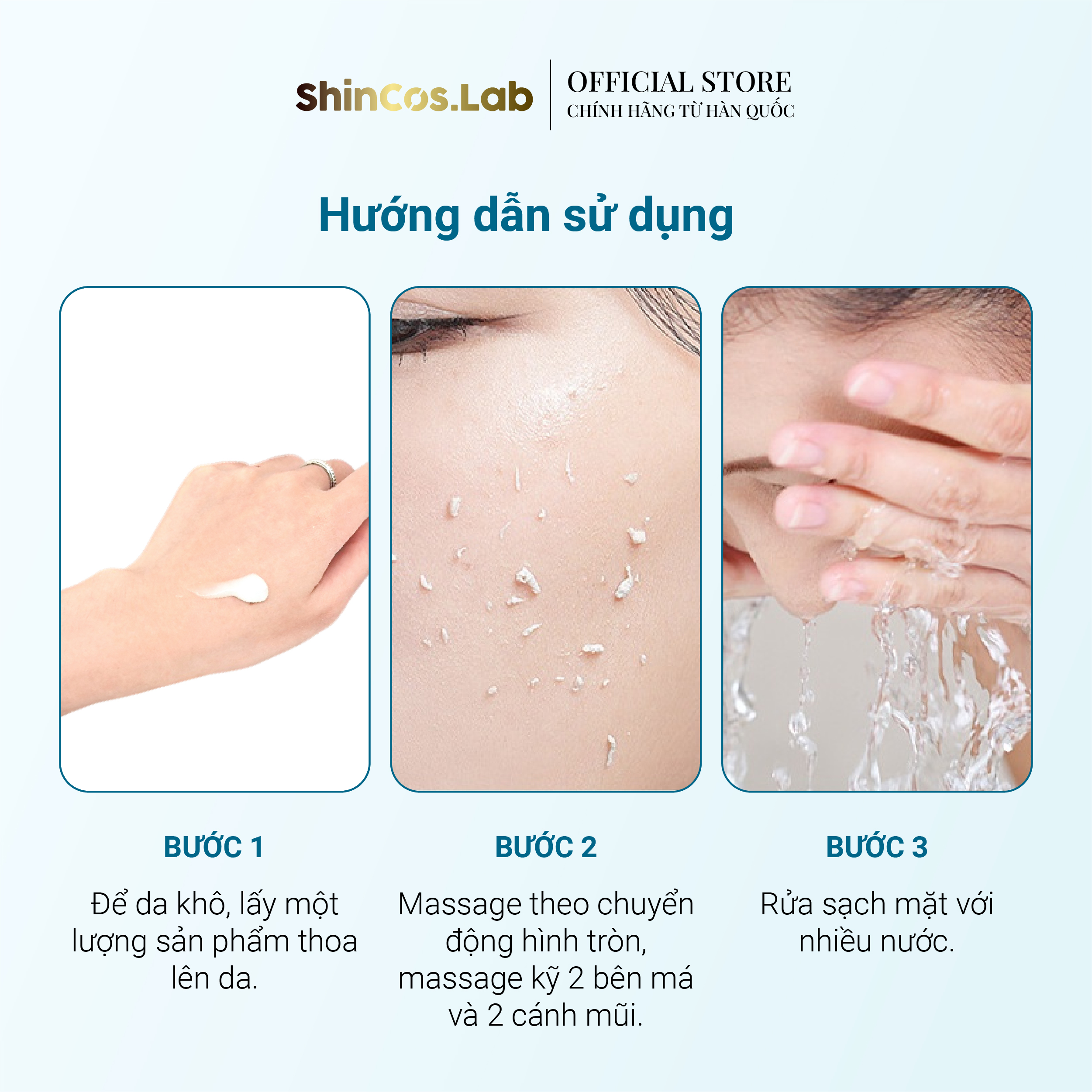 Hướng dẫn sử dụng: (1) Để da khô, lấy một lượng sản phẩm thoa lên da. (2) Massage theo chuyển động hình tròn, massage kỹ 2 bên má và 2 cánh mũi. (3) Rửa sạch mặt với nhiều nước.