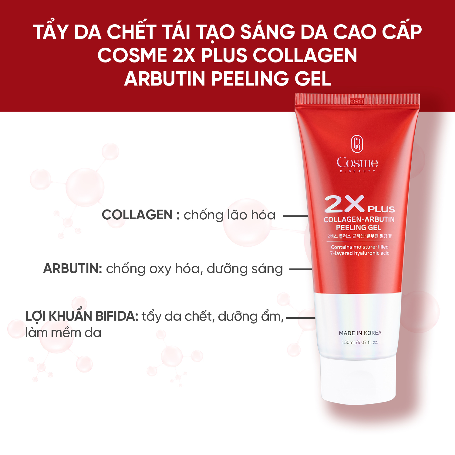 Tẩy tế bào chết vật lý chứa Collagen thuỷ phân và Arbutin có tác dụng chống oxy hoá, cải thiện bề mặt da, loại bỏ tình trạng thô ráp, không đều màu. Kiến tạo nền da sạch, thoáng, mềm mại giúp hấp thụ tốt các dưỡng chất chăm sóc da và lớp make up ít khuyết điểm.