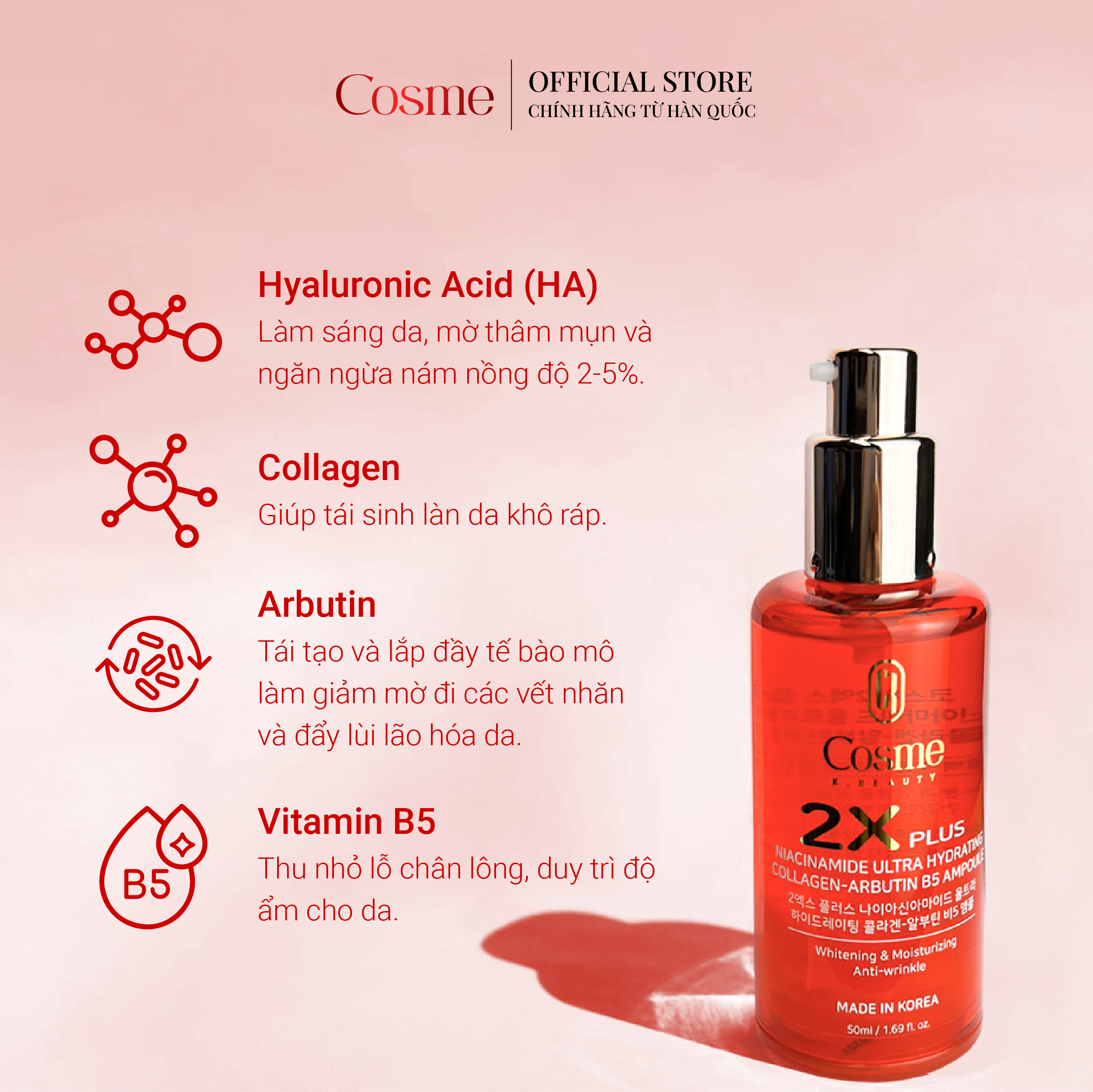 TINH CHẤT TRỊ NÁM– CẤP ẨM – PHỤC HỒI – TRẮNG DA COSME 2X ULTRA HYDRATING COLLAGEN ARBUTIN B5 AMPOULE
