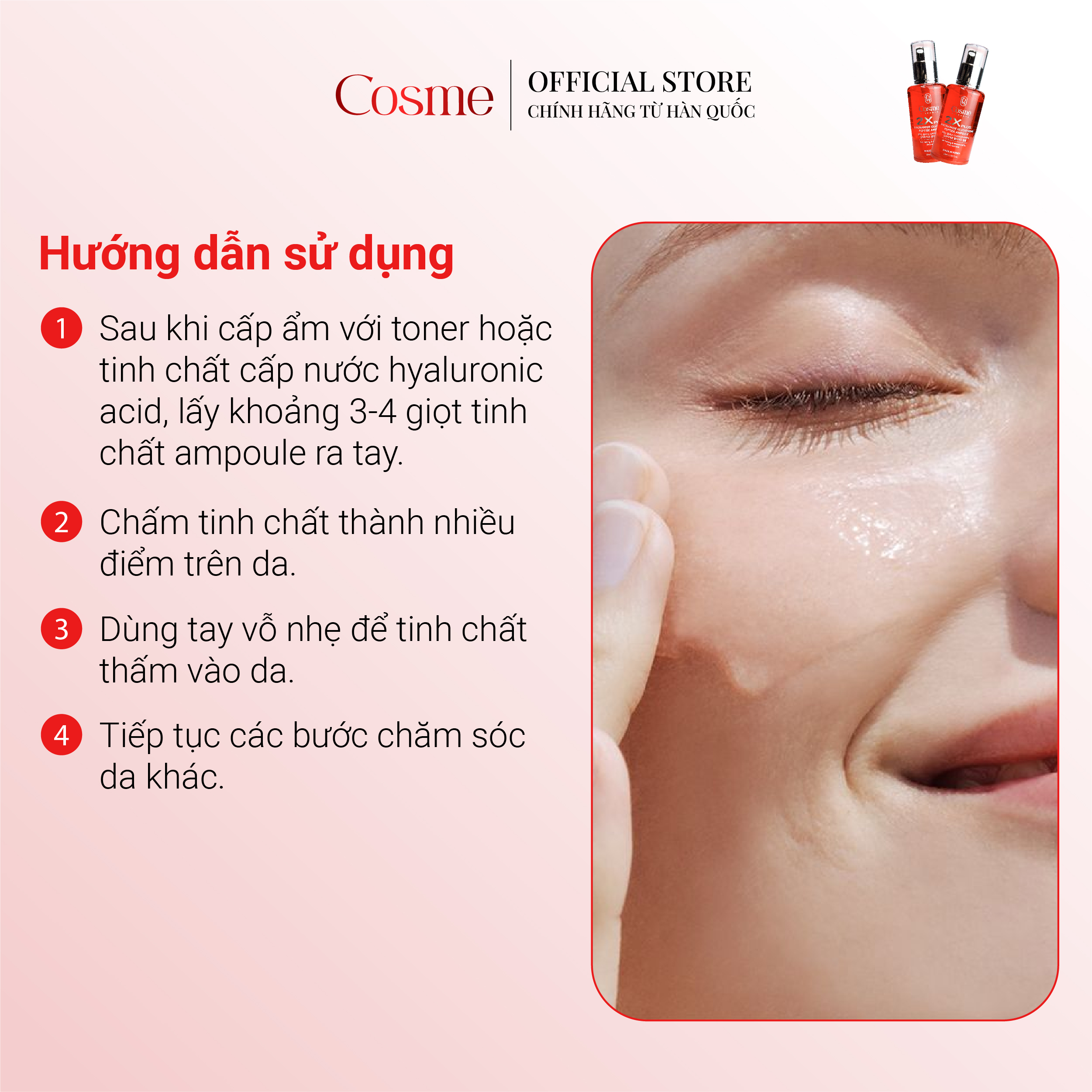 Hướng dẫn sử dụng: (1) Sau khi cấp ẩm với toner lấy khoảng 3-4 giọt tinh chất ampoule ra tay. (2) Chấm tinh chất thành nhiều điểm trên da. (3) Dùng tay vỗ nhẹ để tinh chất thấm vào da. (4) Tiếp tục các bước chăm sóc da khác.